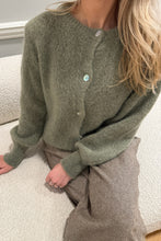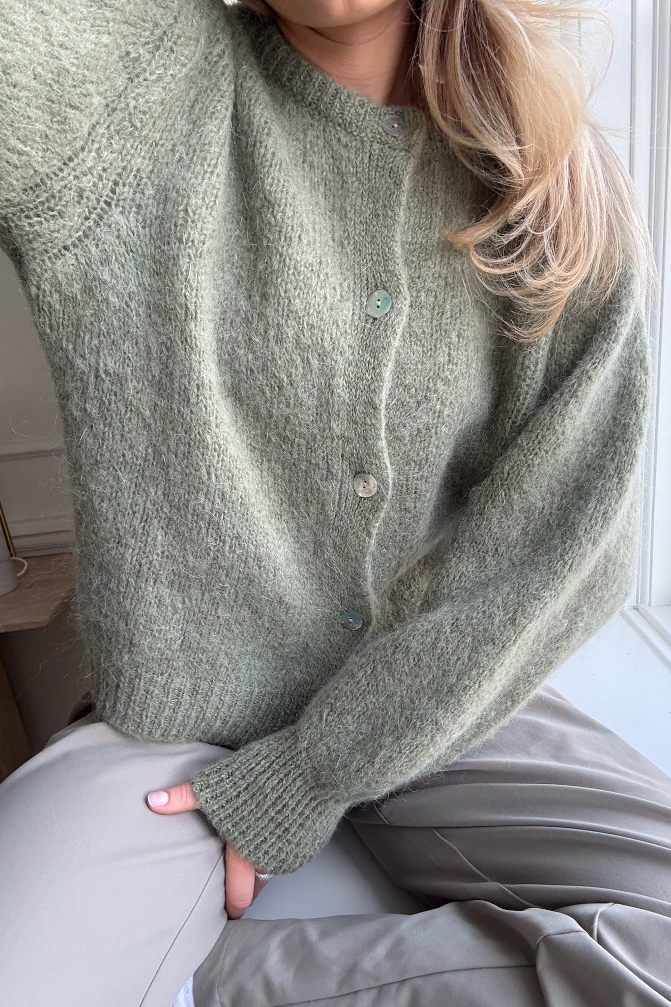 Oppdag komfort og stil med vår populære Idaic oliven cardigan. Denne cardiganen er laget av en luksuriøs, myk ullblanding som føles deilig mot huden og gir en tidløs, avslappet look. Med sin avslappede passform, ballongermer og klassiske perleknapper er denne cardiganen perfekt både til hverdagsbruk og for mer elegante anledninger.