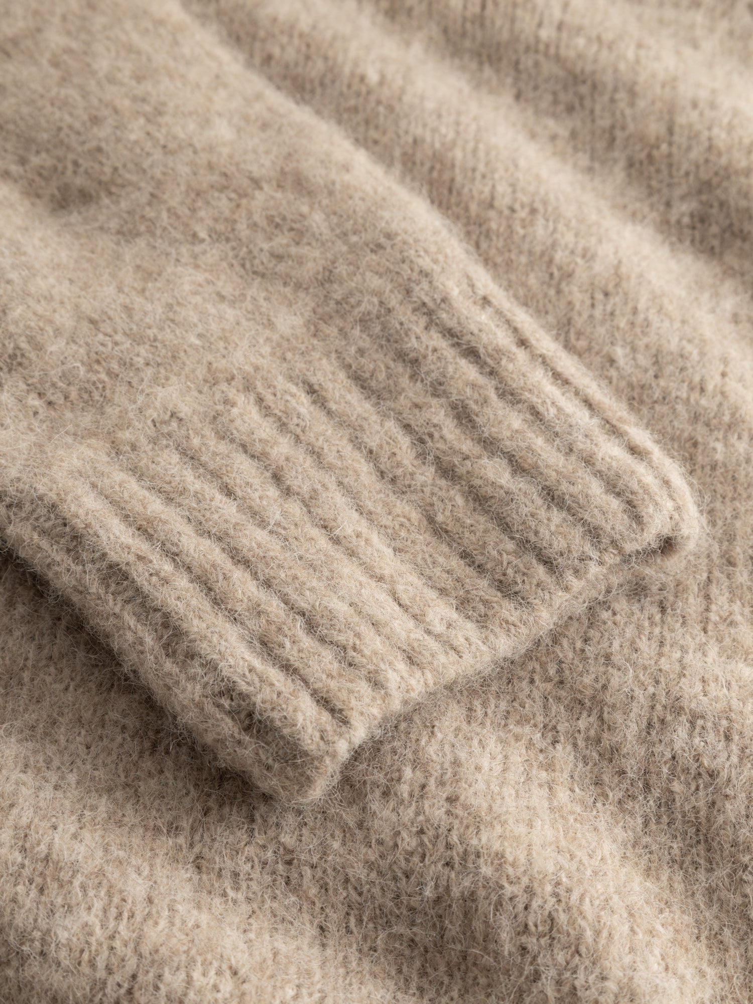 beige strikkegenser dame, myk genser dame, ullgenser dame, varm genser, klassisk genser, tidløs damegenser, høstgenser dame, vintergenser dame, komfortabel hverdagsgenser, basic genser dame, skandinavisk mote, kvalitetsstrikk dame