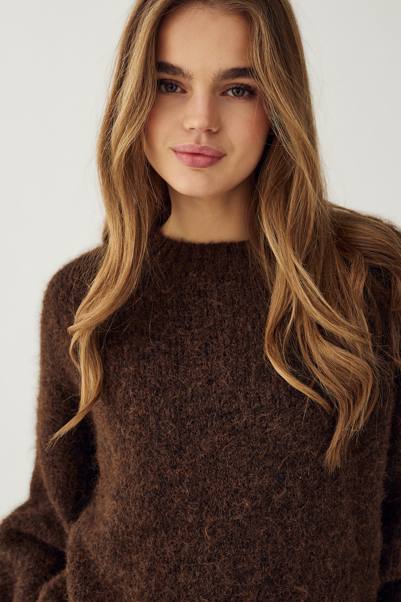 brun strikkegenser dame, myk genser, oversized genser, varm ullgenser, fluffy strikk, komfortabel hverdagsgenser, høstgenser dame, vintergenser, tidløs damegenser, skandinavisk mote, basic genser i brun, kvalitetsstrikk dame