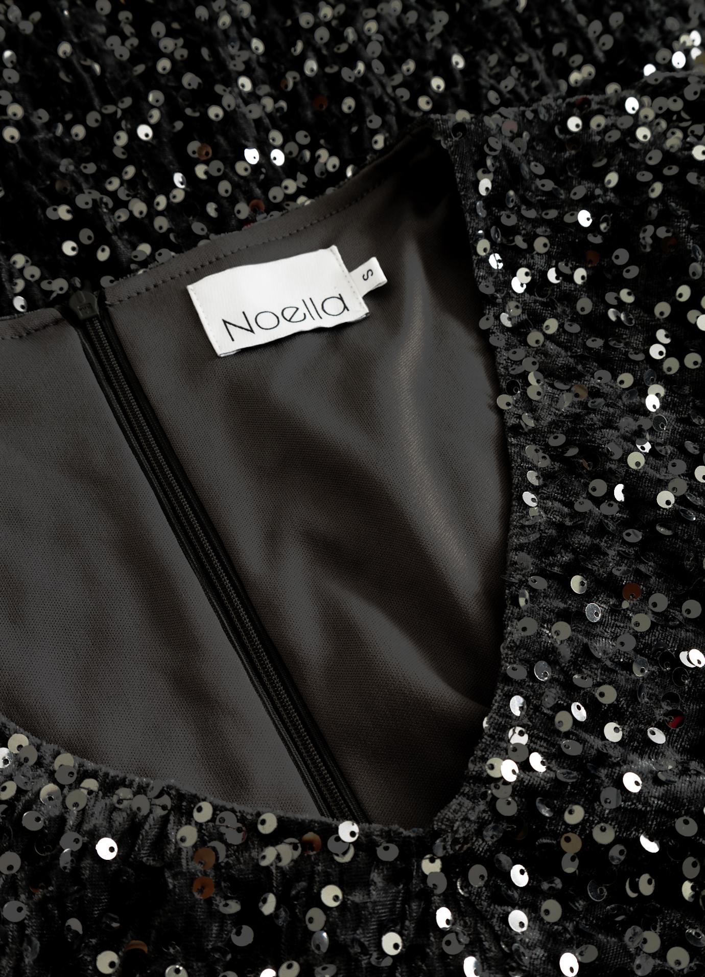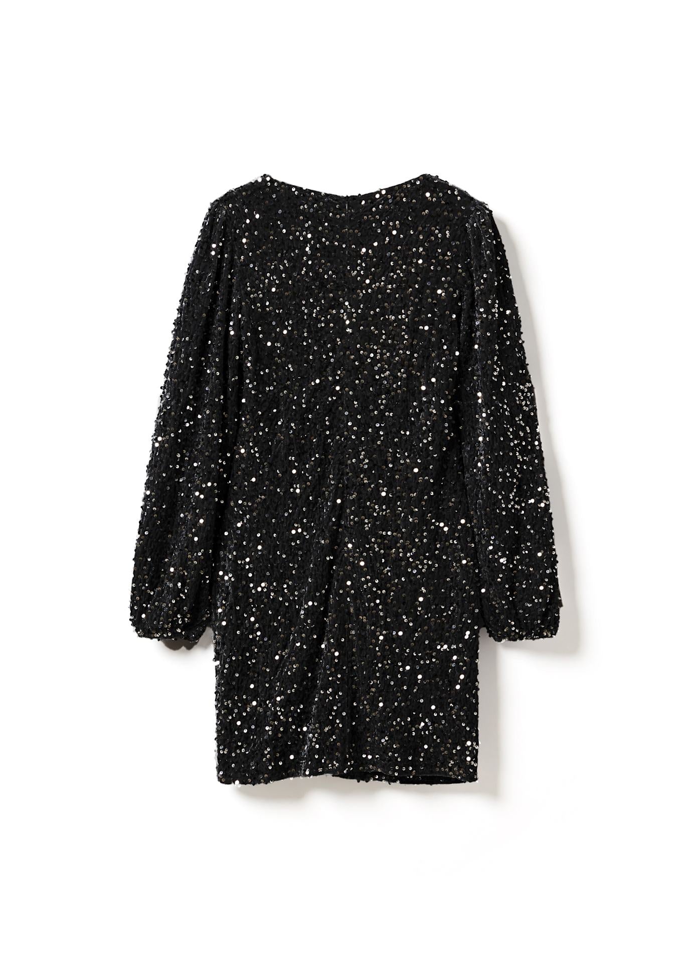 ​Denne nydelige, sorte minikjolen er et perfekt valg for festlige anledninger. Den er dekket av skimrende paljetter som fanger lyset og skaper et elegant, glitrende utseende. Kjolen har en flatterende V-hals, lange ermer med lett volum, og en behagelig passform som gjør den ideell for en kveld med dans og moro. Det tidløse designet og den klassiske fargen sikrer at du vil føle deg chic og selvsikker.