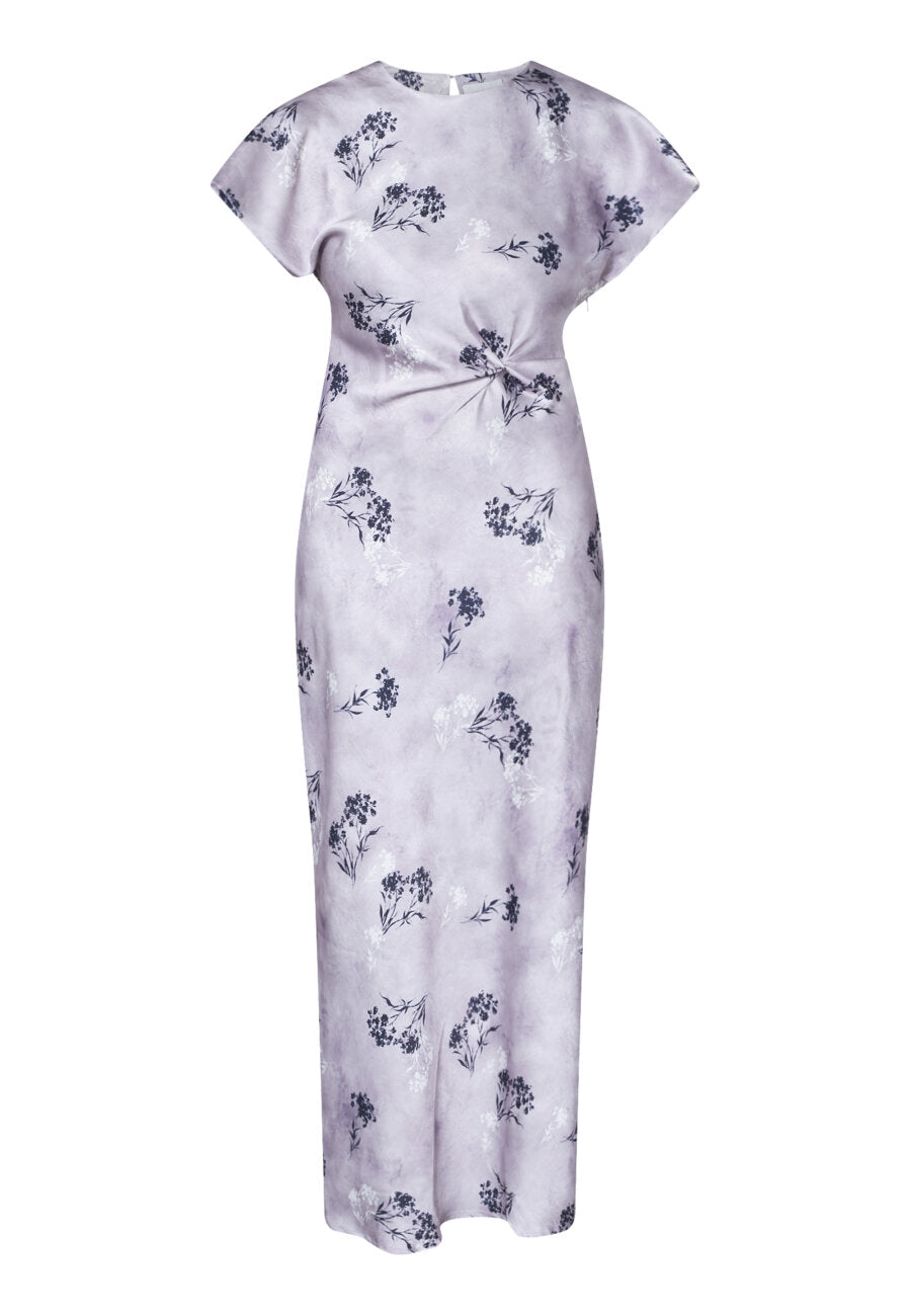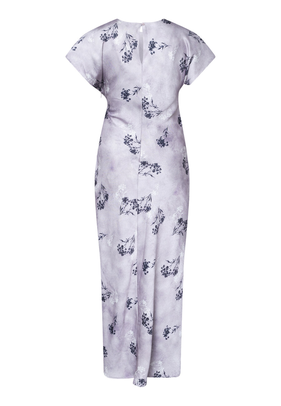Denne elegante lange kjolen kombinerer et sofistikert design med et mykt og romantisk uttrykk. Kjolen kommer i en delikat lys lilla nyanse med et subtilt blomsterprint som gir et feminint og eksklusivt preg. Den rene silhuetten og det flatterende draperte partiet i midjen fremhever figuren på en elegant måte.