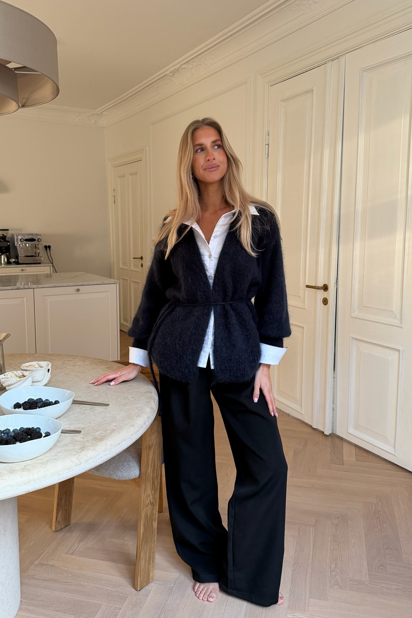 Kardiganen er laget i en utrolig myk og luftig mohair-miks som gir et sofistikert og lunt uttrykk. Med sin klassiske omslagsmodell (wrap design) og et tynt strikket belte i livet, kan du enkelt justere passformen for å fremheve silhuetten.