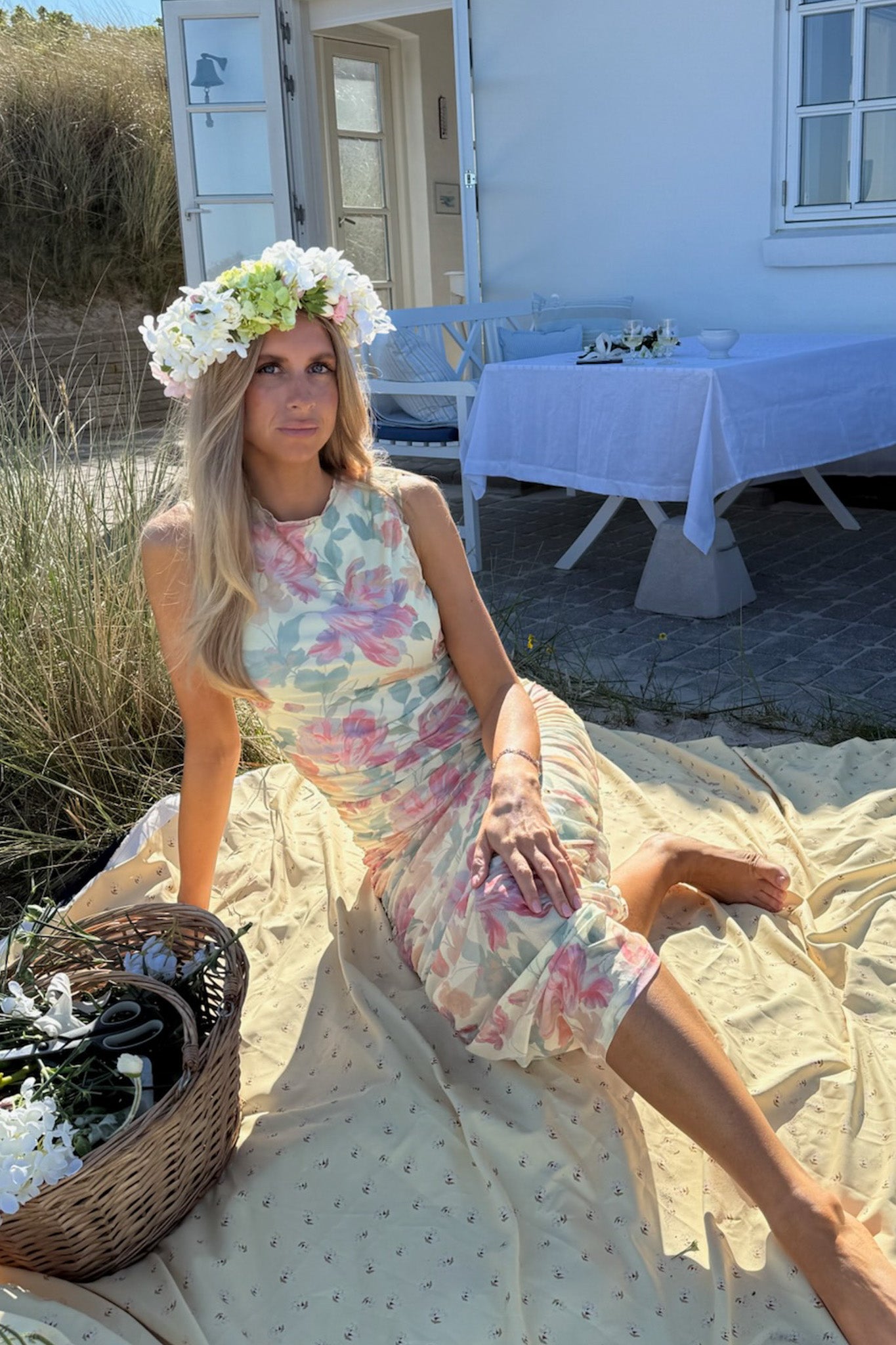 Nøkkelord: sommerkjole dame, midikjole blomster, kjole til bryllup, blomstrete kjole, kroppsnær kjole, pastellkjole, elegant sommerkjole