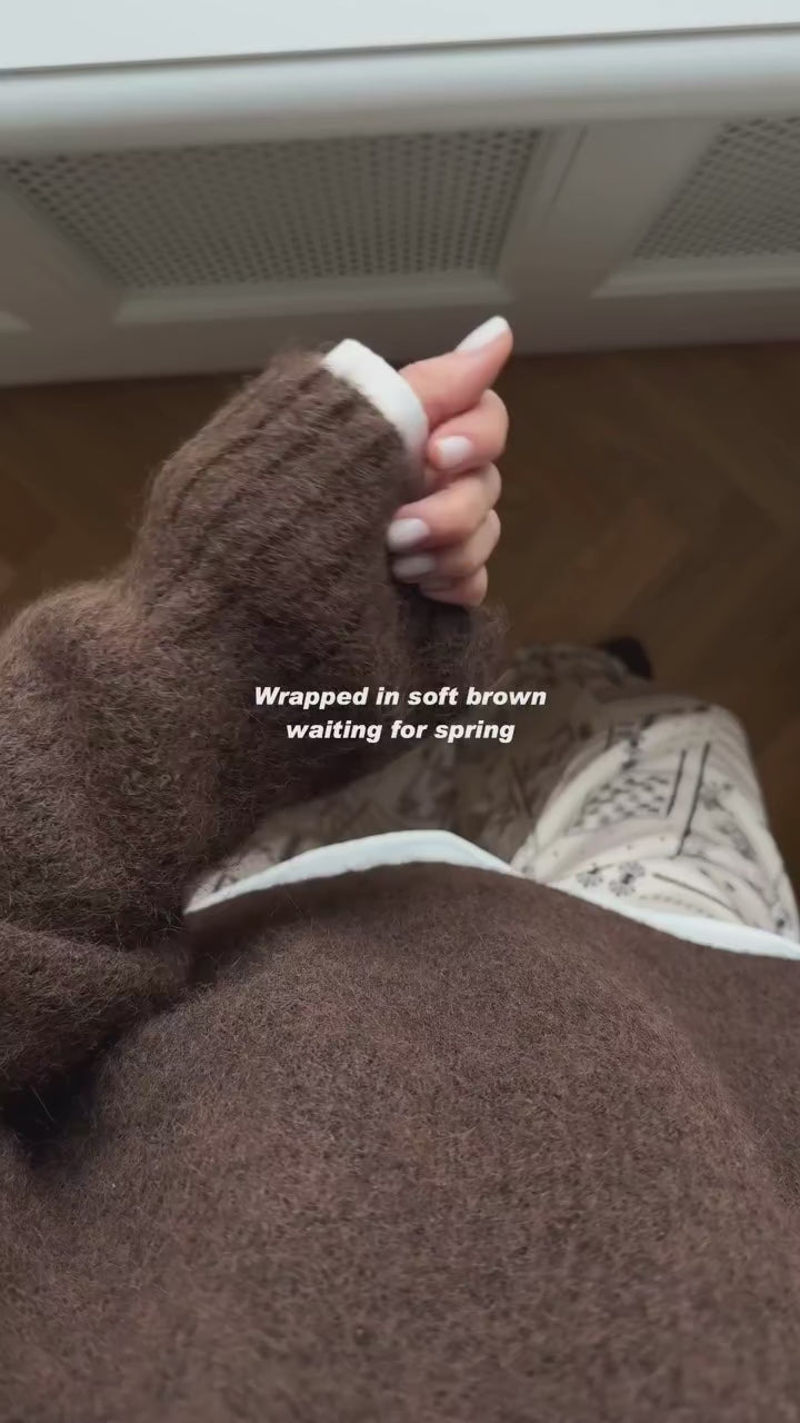 brun strikkegenser dame, myk genser, oversized genser, varm ullgenser, fluffy strikk, komfortabel hverdagsgenser, høstgenser dame, vintergenser, tidløs damegenser, skandinavisk mote, basic genser i brun, kvalitetsstrikk dame